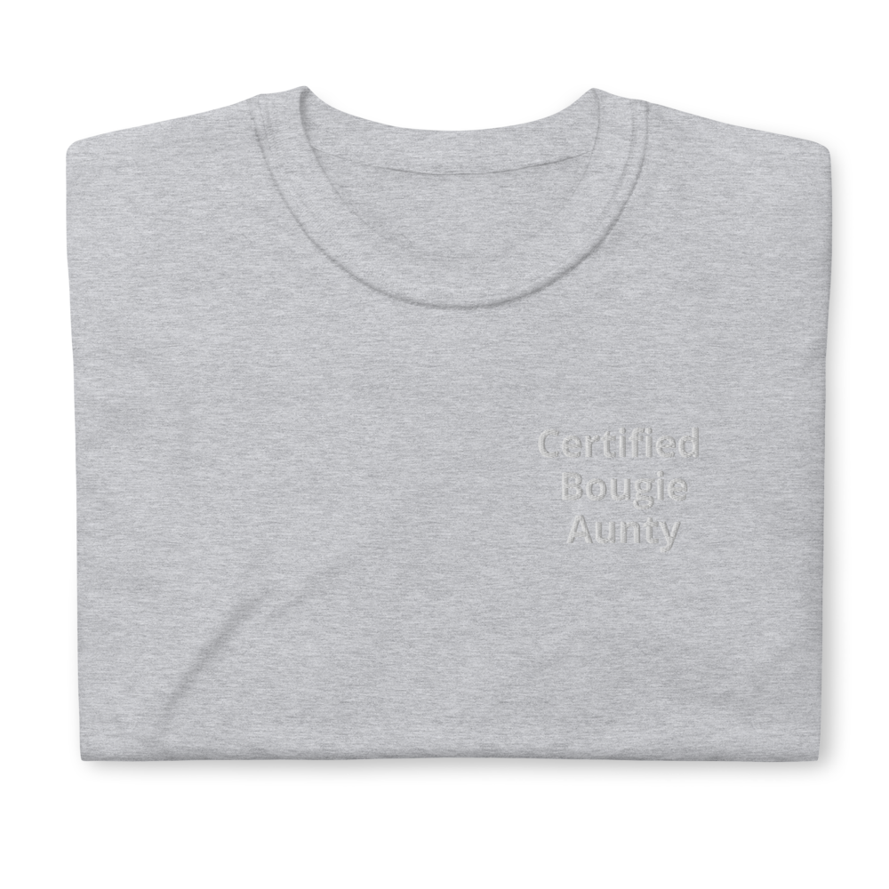 A short-sleeved t-shirt with "Certified Bougie Aunty" Embroidered on the top left side of chest.